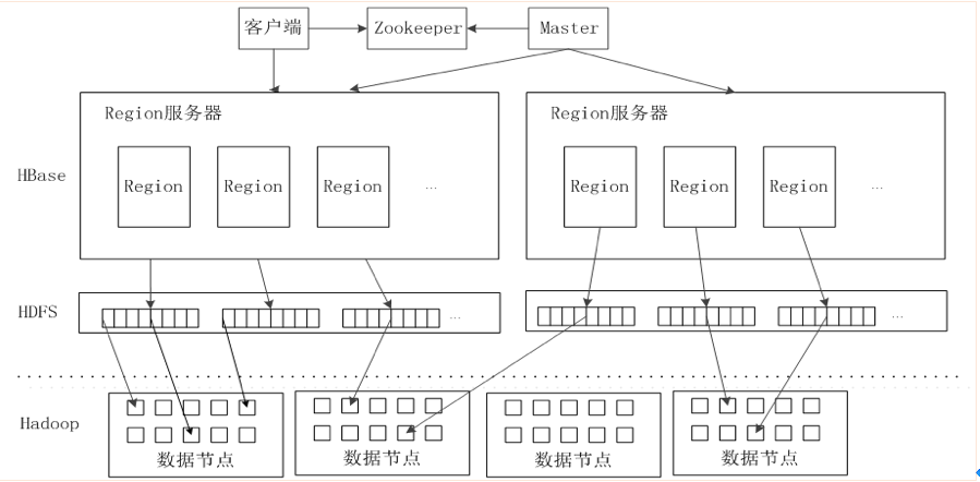 3、Master主要负责表和Region的管理工作。管理用户对表的增加、删除、修改、查询等操作,实现不同Region服务器之间的负载均衡。在Region分裂或合并后,负责重新调整Region的分布,对发生故障失效的Region服务器上的Region进行迁移。