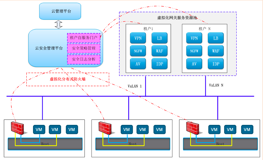 虚拟化分布式防火墙由安全策略管理平台(云安全管理平台)和虚拟化分布式防火墙构成,网络采用VxLAN架构。