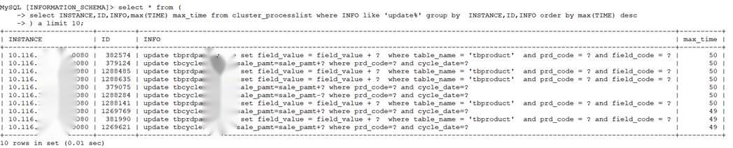 select ID,INSTANCE,INFO,max(TIME) max_time from cluster_processlist where INFO like ‘update%’ group by INSTANCE,ID,INFO order by max(TIME) desc