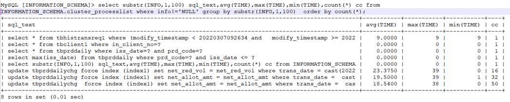 select substr(INFO,1,100) sql_text,avg(TIME),count(*) cc from cluster_processlist where info!=‘NULL’ group by substr(INFO,1,100) order by count(*);