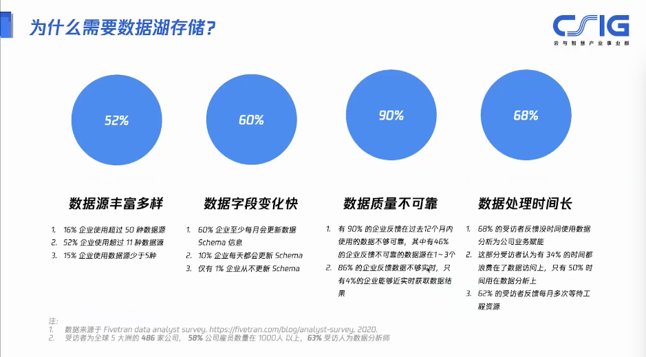 为什么需要数据湖存储这样的服务?一个最直接的原因就是数据越来越多了,不仅仅意味着数据规模的增加,数据字段、格式的增加,而数据增加,我们投入在数据清洗还有分析这样的环节的时间也变得更多,相应的企业效率就可能会降低。
