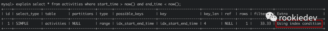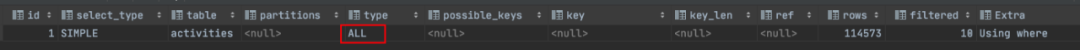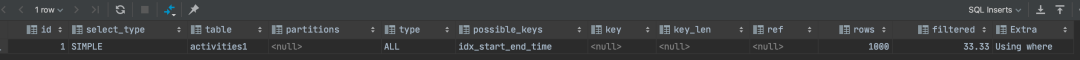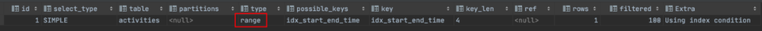 以我们对索引的了解,活动表上已经建了 start_time 和 end_time 的联合索引 idx_start_end_time,上面的 SQL 肯定会通过 idx_start_end_time 索引去查询,因此上面的 SQL 执行速度应该不会慢的,但事实上真的是这样吗,如果不是这样的话,我们该如何去评估这个 SQL 的执行速度呢,那就是通过 EXPLAIN 指令,也是我们今天要重点介绍的内容,通过 explain 的执行结果我们可以看到以下内容: