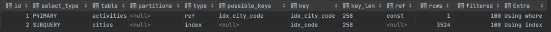 1explain select * from activities where city_code = (select code from cities limit 1);