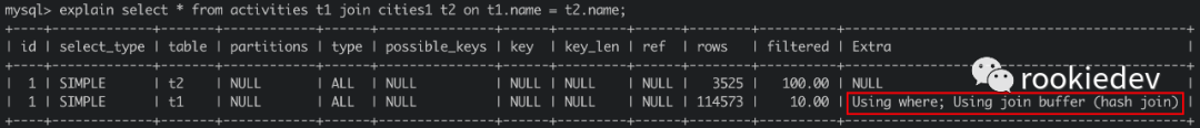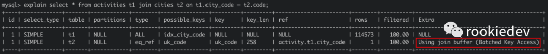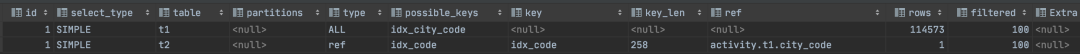 1explain select * from activities t1 join cities t2 on t1.city_code = t2.code;