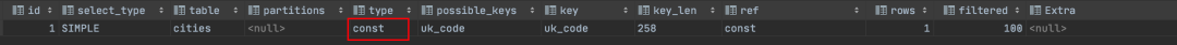 const: 主要是在通过主键或者唯一键等值查询的时候,type 字段的值是 const