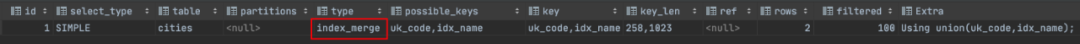 index_merge: 在 where 条件中的字段需要利用多个索引进行查询,这时 type 字段值就是 index_merge 类型,常见于多个索引字段进行 or 查询