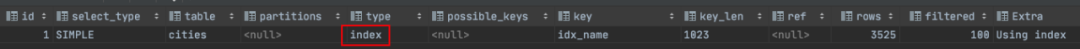 key: 表示查询过程中使用的索引,如果为 null 则表示该查询没有使用索引,该列的值有可能存在 possible_key 列中没有出现的索引,同时当查询满足覆盖索引的条件时,possible_keys 列为 NULL,索引仅在 key 列显示