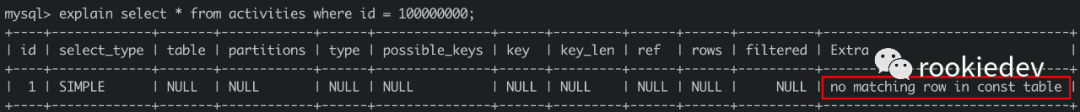no matching row in const table: 通常根据主键查询的数据在表中不存在,Extra 列的值是这个