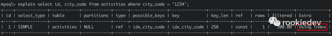 Using index: 表示利用到了我们在之前文章里面提到的索引覆盖优化功能,通常是要查询的字段以及条件字段都已经在索引中存在,也就是说通过索引树就可以满足查询条件以及结果,不需要再到主键索引树中查询该记录完整的数据,减少回表的过程