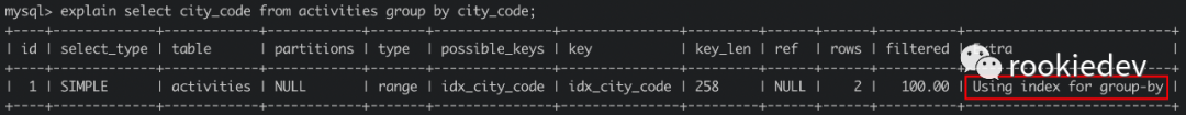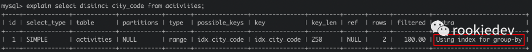 Using index for group-by: 和 Using index 意思差不多,不过就是查询语句中如果包含了 distinct 和 group by 关键字的时候 Extra 里面的内容就是 Using index for group-by 了