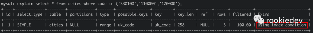 Using index condition: 表示利用到了在我们在之前文章里面同样提到过的索引下推优化功能,在 “仅能利用最左前缀索引的场景” 下(无法能利用全部联合索引),对不在最左前缀索引中的其他联合索引字段加以利用,在遍历索引时,由只传入可以利用到的字段值,改成了多传入下推字段值进行过滤,过滤会减少遍历索引查出的主键条数,从而减少回表次数,提升整体性能,对于 Using index 和 Using index condition 不是很熟悉的话建议去看之前的文章 深入理解 MySQL 索引(二)