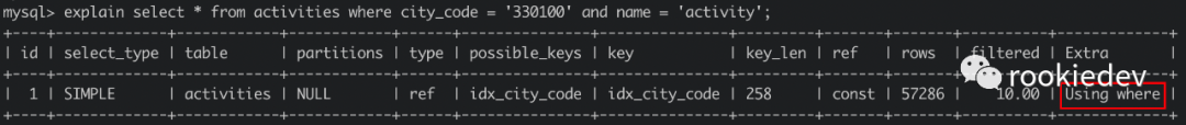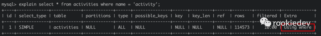 Using where: 表示该查询需要在 Server 层得到存储引擎返回的结果之后需要再次进行过滤,这种情况可能使用了索引,只不过存在其他条件不在索引字段中,也有可能就完全没有使用索引