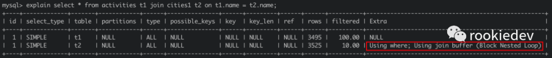 Using join buffer (Block Nested Loop): 表示在 join 联表查询的时候,当被驱动表的联表字段上没有索引的时候,Extra 里面就会出现这个值,但注意的是在 MySQL 8.0 版本之后 Extra 里面的值是 Using join buffer (hash join),当出现不管是 Using join buffer (Block Nested Loop) 还是 Using join buffer (hash join) 我们都应该想办法进行优化,简单的做法就是在被驱动表的关联字段上建索引