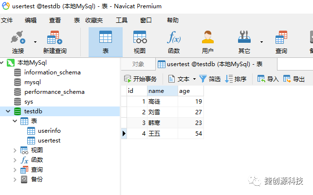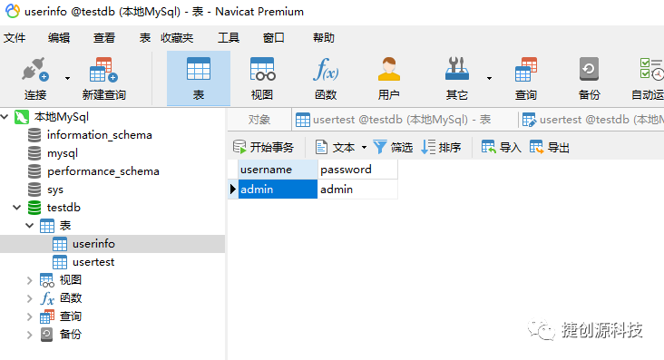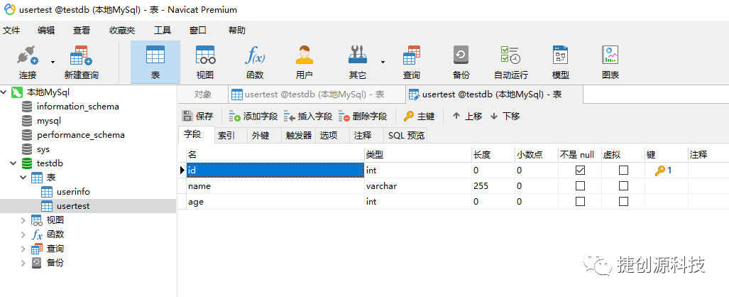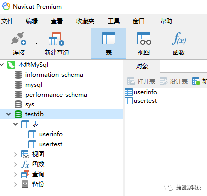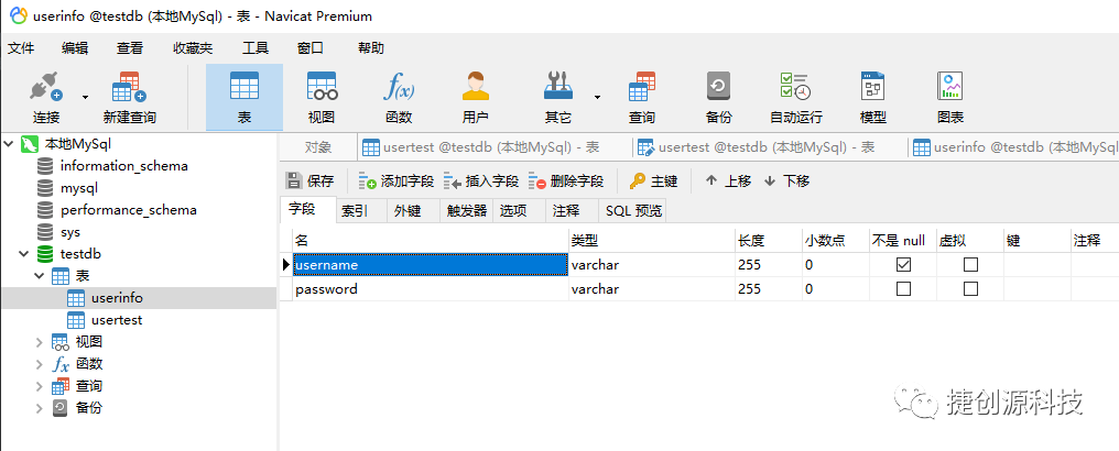 利用Navicat Premium 15连接mysql数据库,新建testdb数据库,并在该数据库下添加2个表,usertest和userinfo