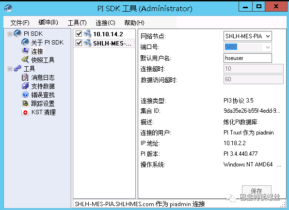 严重: Cannot connect to the data source using "Provider=PIOLEDB; Session ID=-1;Data Source=10.18.2.2; Integrated Security=SSPI;Log File= ; Time Zone=local; Always Return Rowset=false;"