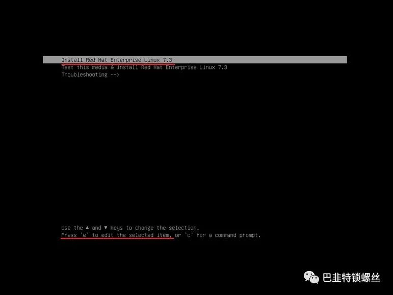 进入GRUB菜单,移至”Install Red Hat Enterprise Linux 7.X”一行上按”E”键编辑启动参数。