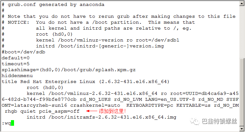 编辑/etc/grub.conf文件,在kernel一行最后添加 pcie_aspm=off,保存重启生效。