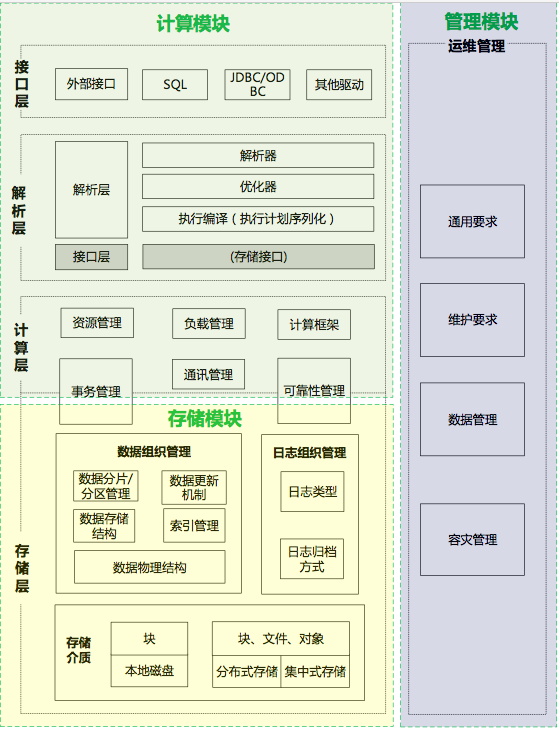 就分布式数据库的技术框架而言,可分为计算模块、存储模块和管理模块。各模块的技术框架介绍如下: