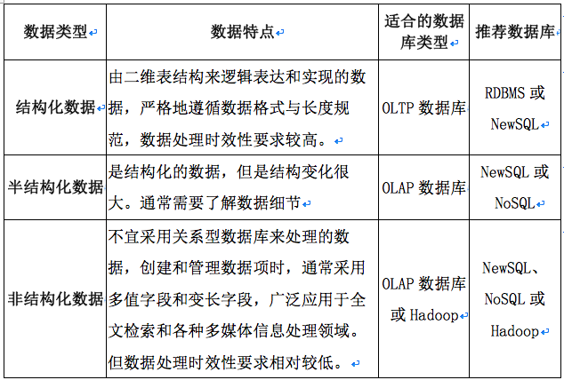 数据按其组织结构,可分为结构化数据、半结构化数据和非结构化数据。各类数据的特点如下: