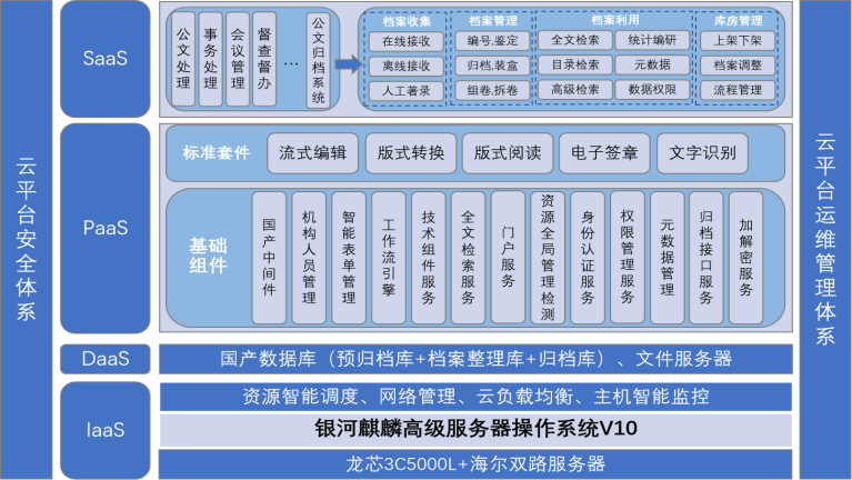 联合解决方案整套环境运行于银河麒麟高级服务器操作系统V10、神通数据库、东方通中间件、数科版式转换系统等国产基础软件之上,方案中文档一体化管理平台的登录环节由龙芯3A5000/3C5000L芯片内置的GMSF和KF模块进行加密处理,实现了自主与安全的深度融合。