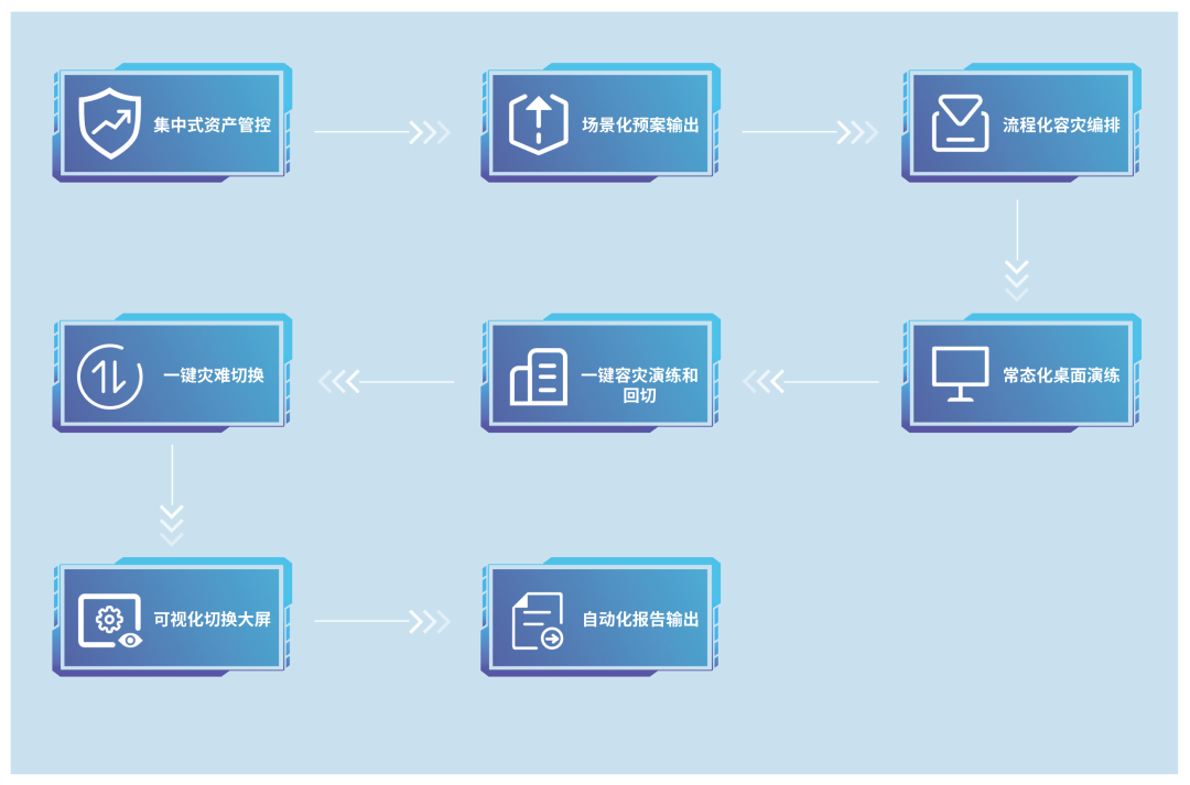对建设完成的容灾系统,提供日常运营服务,如搭建切换指挥和状态监控大屏,实时显示灾备状态、应急切换过程和切换时长,给灾难发生时的决策指挥提供有力支撑;提供便捷可视化及可持续更新的组织容灾预案管理能力;提供常态化桌面演练和一键自动切换能力。
