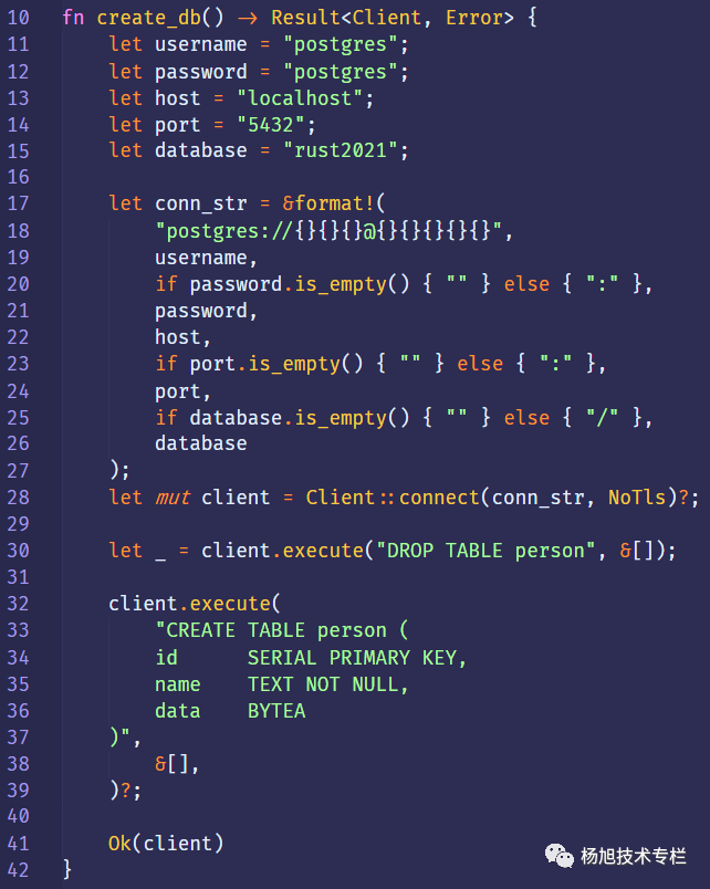 再创建 create_db 函数,用来创建数据库和表,它返回一个 Result,里面可能是 Client或错误: