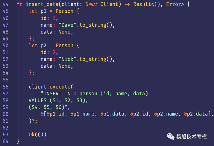use postgres::{error::Error, Client, NoTls};#[derive(Debug)]struct Person {id: i32,name: String,data: Option<Vec<u8>>,}fn create_db() -> Result<Client, Error> {let username = "postgres";let password = "postgres";let host = "localhost";let port = "5432";let database = "rust2021";let conn_str = &format!("postgres://{}{}{}@{}{}{}{}{}",username,if password.is_empty() { "" } else { ":" },password,host,if port.is_empty() { "" } else { ":" },port,if database.is_empty() { "" } else { "/" },database);let mut client = Client::connect(conn_str, NoTls)?;let _ = client.execute("DROP TABLE person", &[]);client.execute("CREATE TABLE person (id SERIAL PRIMARY KEY,name TEXT NOT NULL,data BYTEA)",&[],)?;Ok(client)}fn insert_data(client: &mut Client) -> Result<(), Error> {let p1 = Person {id: 1,name: "Dave".to_string(),data: None,};let p2 = Person {id: 2,name: "Nick".to_string(),data: None,};client.execute("INSERT INTO person (id, name, data)VALUES ($1, $2, $3),($4, $5, $6)",&[&p1.id, &p1.name, &p1.data, &p2.id, &p2.name, &p2.data],)?;Ok(())}fn get_data(client: &mut Client) -> Result<Vec<Person>, Error> {let mut persons = Vec::new();for row in client.query("SELECT id, name, data FROM person", &[])? {persons.push(Person {id: row.get(0),name: row.get(1),data: row.get(2),});}Ok(persons)}fn main() -> Result<(), Error> {let mut client = create_db()?;insert_data(&mut client)?;let persons = get_data(&mut client)?;for p in persons {println!("Person: {:?}", p);}Ok(())}