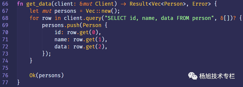 这里,我们直接对 Client 的 query 方法返回的结果进行遍历,最后方法返回一个 Vec。