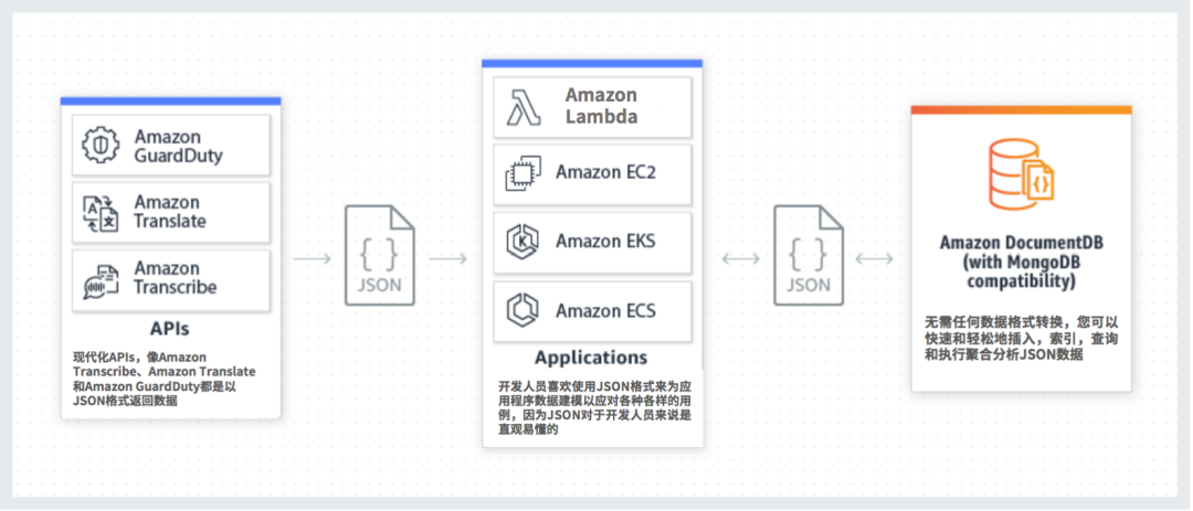 作为一个 NoSQL 数据库,Amazon DocumentDB 使插入、查询、索引 JSON 数据以及对 JSON 数据执行聚合变得简单。