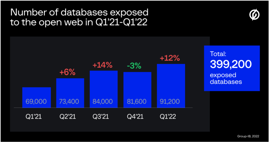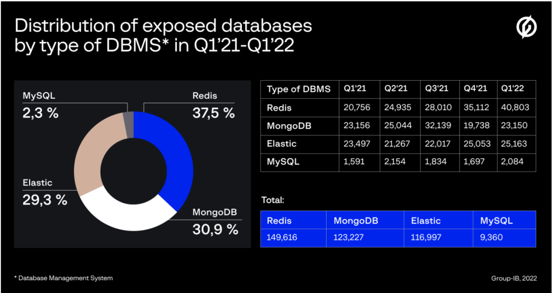 BleepingComputer 网站消息,威胁情报和研究公司 Group-IB 共享的一份报告中显示,公开暴露在互联网上的数据库数量近期有所增加 ,从 2021 年的 308000 个持续增长,截至 2022 年第一季度,暴露的数据库峰值数量已达 91200 个,创造了历史记录。