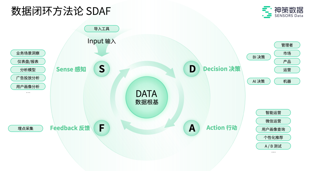 发展至今,从最初的神策分析到“两云一平台”,神策数据正处于快速拓展市场和行业战略深化阶段,资方的加持将推动公司战略的持续落地。神策数据创始人 & CEO 桑文锋在公司成立七周年时,进一步明确了核心理念、运作体系及产品战略等,他表示,公司战略已经非常清晰且坚定。用科学的方法提升效率,数据驱动是新时代的科学方法。“重构数据根基,打造数据闭环”是神策数据围绕数据驱动的核心理念。“数据源很重要”是神策数据成立以来一直坚持的特有认知,因此坚持帮助客户建立数据根基,截止目前,神策每天帮助客户新结构化的行为数据超过 2500 亿条。过去七年的成绩验证了这一理念,未来神策数据将持续坚守。神策数据的产品理念由之前的数据驱动业务决策和产品智能,升级至数据闭环方法论 SDAF,即 Sense → Decision → Action → Feedback,并提供了覆盖全域用户经营、全链路分析、全场景营销的数字化闭环解决方案,目的是让数据能够真正驱动客户业务,释放价值。