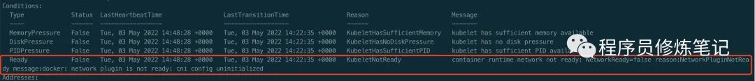 通过上图可以看出,Node处于NotReady状态的原因是未部署任何的网络插件。
