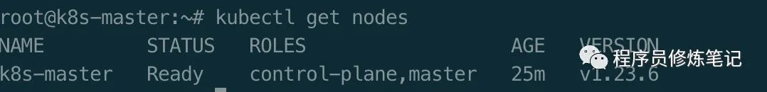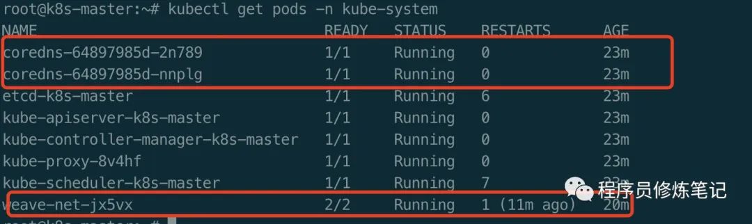 在我们的网络插件部署成功以后,coredns的Pod状态变为Running,并且master节点也变为了Ready状态。