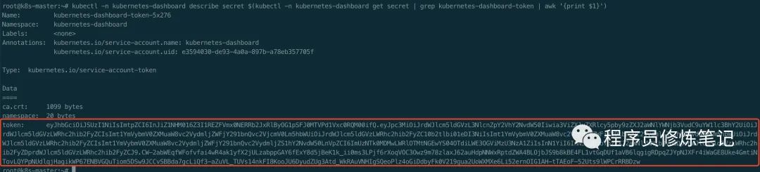 $ kubectl -n kubernetes-dashboard describe secret $(kubectl -n kubernetes-dashboard get secret | grep kubernetes-dashboard-token | awk '{print $1}')