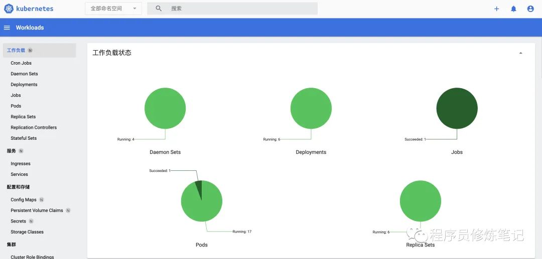 当我们部署存储插件以后,整个Kubernetes集群就搭建完成了,一个崭新的Kubernetes集群就映入眼帘。