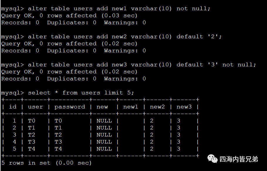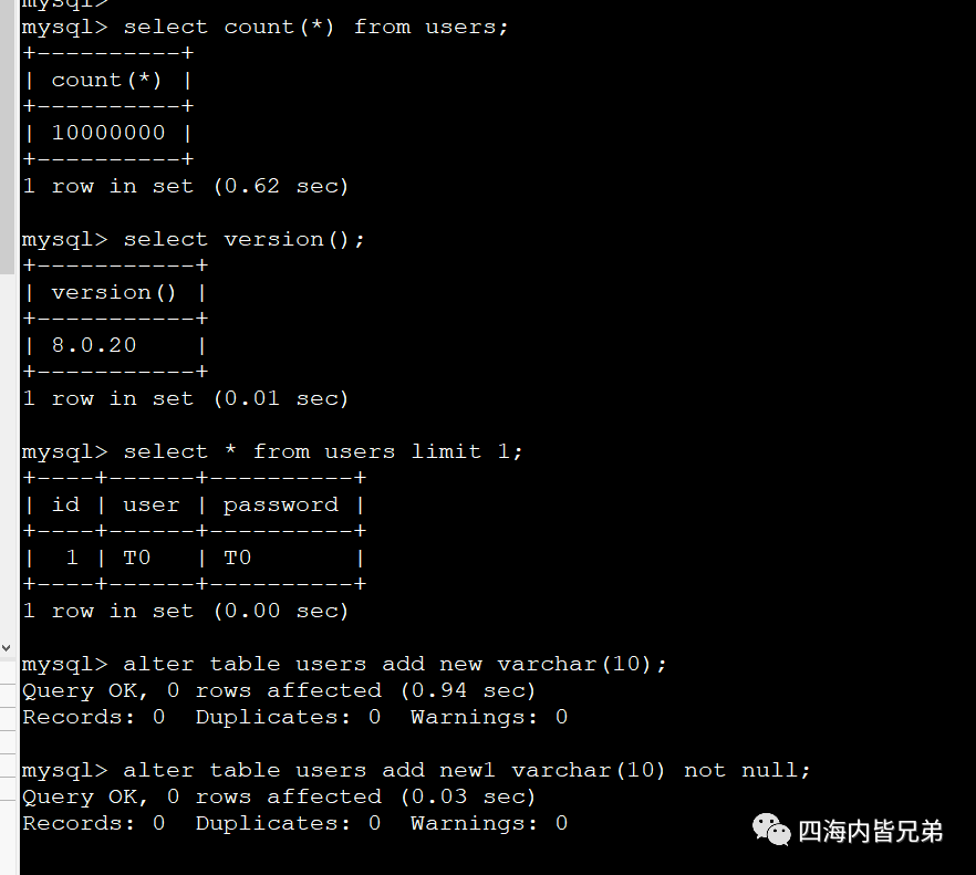 ; 用这一句替代了上面的3句。毫秒级别就可以完成。因为这样其实没有执行全表更新只是在数据字典上加上了个默认值。Oracle认为,只要定了了默认值,而且还是非空的。那么先不加,等调用的时候才真正的赋值。这是非常聪明的做法。就像量子力学中的薛定谔的猫。这个在Oracle11G中实现。应该是最早开创这样使用的。不过如果不带not或者不带default。不行。MySQL呢,如果大表加字段怎么做?答案就是升级到8.0.在MySQL8以后也可以享受到这个功能。