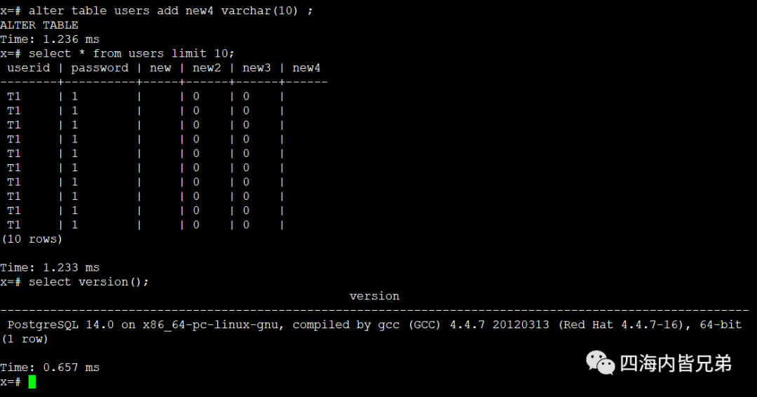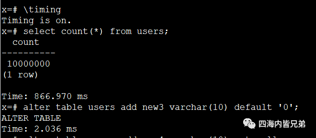 那么PostgreSQL呢?也来一个1000万的表。可以看出无论带不带默认值都很快。我演示从简了。