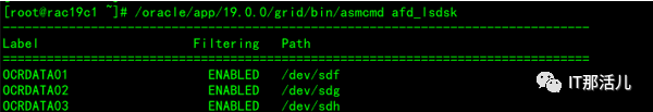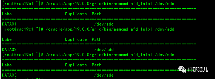 #/oracle/app/19.0.0/grid/bin/asmcmd afd_lslbl dev/sdc#/oracle/app/19.0.0/grid/bin/asmcmd afd_lslbl dev/sdd#/oracle/app/19.0.0/grid/bin/asmcmd afd_lslbl dev/sde#ls -ltr dev/oracleafd/disks