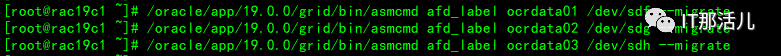 #/oracle/app/19.0.0/grid/bin/asmcmd afd_label ocrdata01 dev/sdf --migrate#/oracle/app/19.0.0/grid/bin/asmcmd afd_label ocrdata02 /dev/sdg --migrate#/oracle/app/19.0.0/grid/bin/asmcmd afd_label ocrdata03 /dev/sdh --migrate#/oracle/app/19.0.0/grid/bin/asmcmd afd_lsdsk