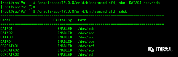 su -#/oracle/app/19.0.0/grid/bin/asmcmd afd_label DATA04 /dev/sde#/oracle/app/19.0.0/grid/bin/asmcmd afd_lsdsk