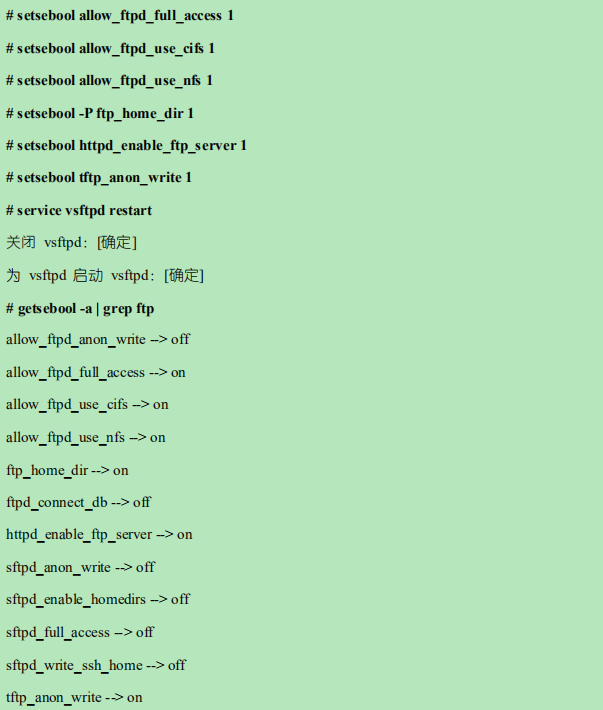 如果使用 setsebool-P ftpd_disable_trans 1 //加-P 表示永久性。