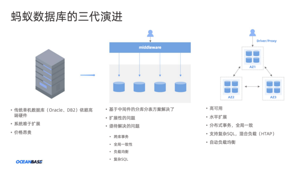 随着互联网行业的发展,对数据库提出了越来越高的要求——除了“提效率”与“降成本”,还有“解痛点”。传统数据库在处理业务需求时遇到了很多的问题,这些问题在蚂蚁也都经历过,首先我来简单讲讲蚂蚁集团数据库的演进过程。