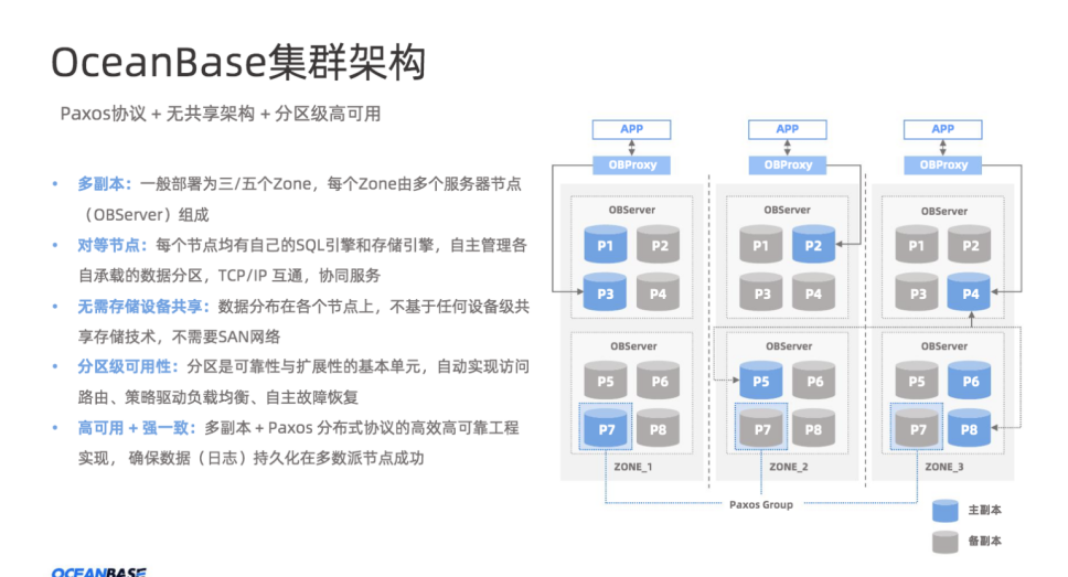 OceanBase 中的数据以分布式的方式进行存储,这样为数据库的线性扩展性提供了理论基础,自动实现访问路由、策略驱动负载均衡。同时 OceanBase 的集群架构还具有高可用和强一致的特性,通过 multi-Paxos 分布式协议的工程实现,确保数据(日志)持久化在多数派节点成功,少数派故障时能够做到数据不丢失,故障转移自动完成。