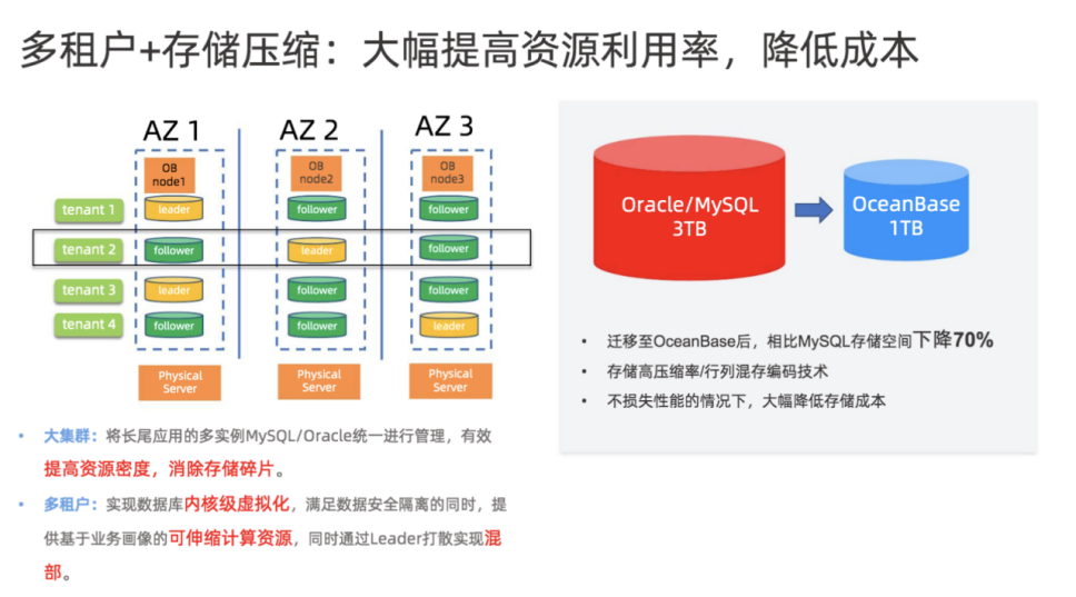 OceanBase 的第一个特性是多租户+存储压缩,能够大幅提高资源利用率,降低成本。
