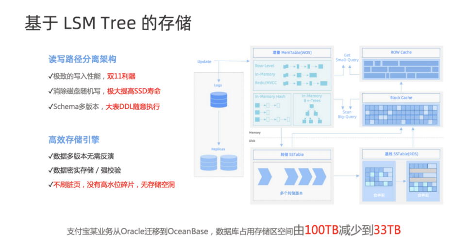 在支撑支付宝某业务从 Oracle 迁移到 OceanBase 中,实现了数据库占用存储区空间由 100TB 减少到 33TB。