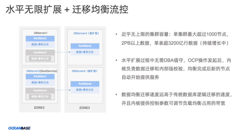 图6 OceanBase 特性:水平无限扩展+迁移均衡流控