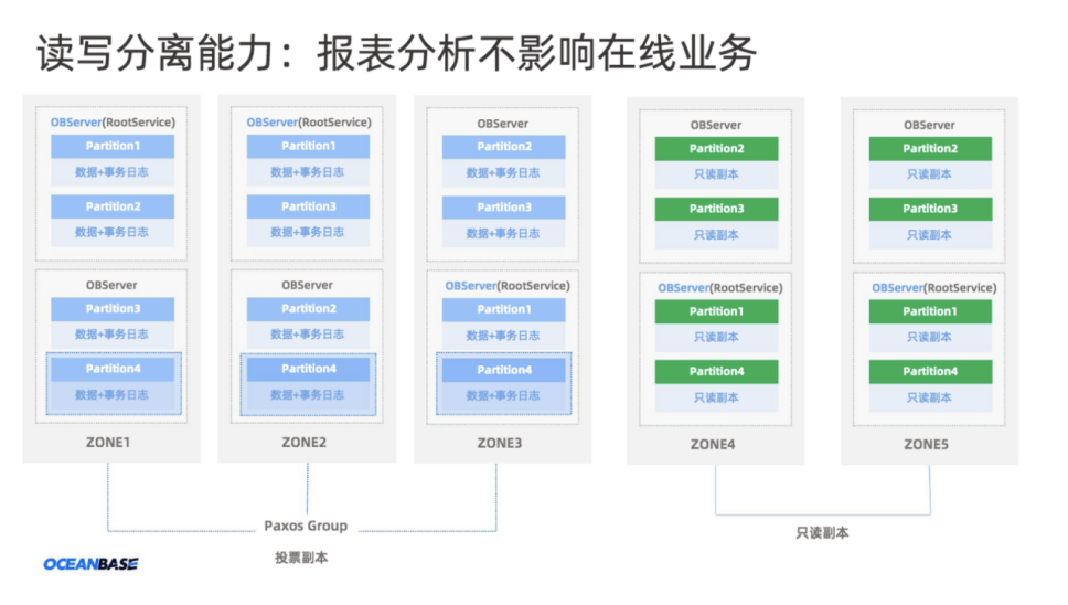 不仅如此,OceanBase 在多副本上实现的读写分离的能力,大大提升了数据库读扩展能力的同时,AP 类的报表分析不影响在线业务。