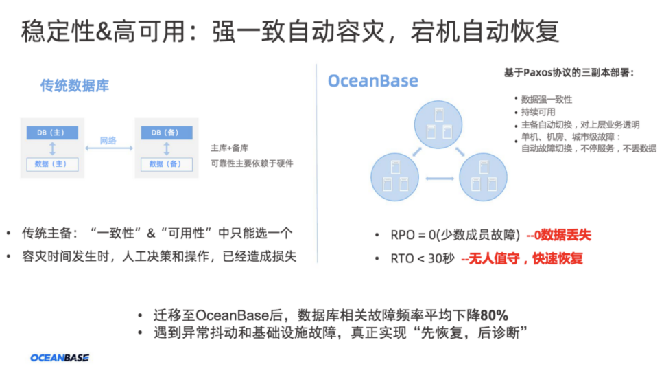 OceanBase 的稳定性高可用特性,帮助业务实现强一致自动容灾、宕机自动恢复。当业务从传统数据库迁移至 OceanBase 后,数据库相关故障频率平均下降 80%,同时遇到异常抖动和基础设施故障,真正实现“先恢复、后诊断”。