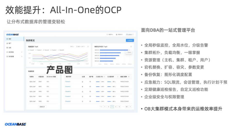 接下来想谈一谈 OceanBase 在智能化运维的一些能力。OCP 是 OceanBase 提供的面向 DBA 的一站式管理平台,让分布式的数据库管理变轻松,实现健康巡检、全集群日志在线分析、监控下钻分析以及智能运维体系 SQL 诊断。