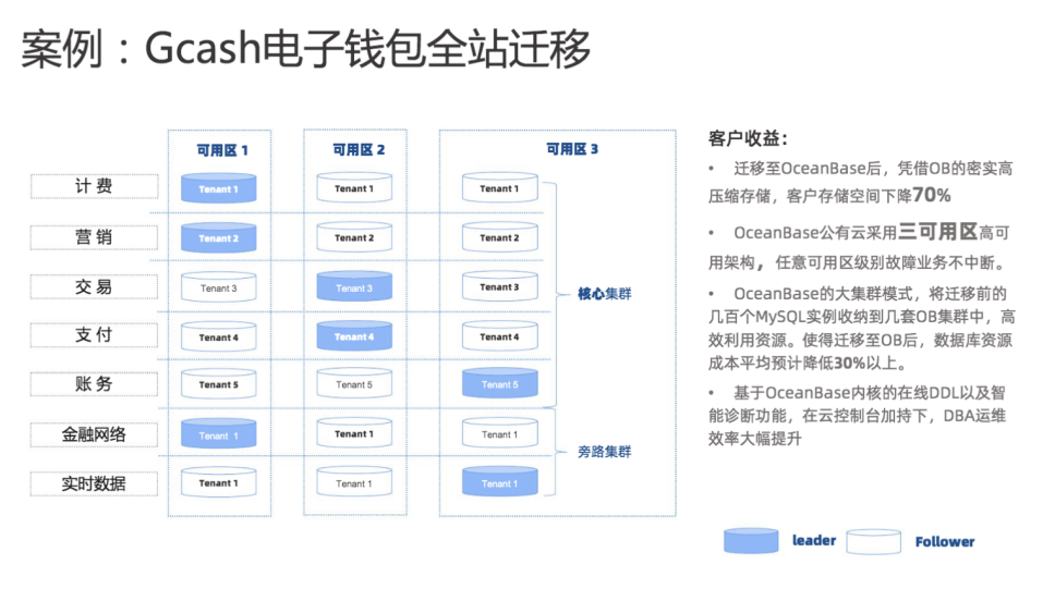 Gcash 电子钱包全站迁移到 OceanBase,实现存储空间下降70%,故障业务不中断、成本降低 30% 的可观效果,同时在云控制台的加持下,DBA 运维效率大幅提升。